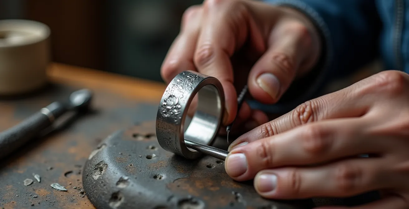 Una joya martillada no solo tiene una textura única, sino que es estructuralmente más resistente a las abolladuras y deformaciones. Ha sido «estresada» de forma controlada para ser más fuerte. Como explican los talleres más prestigiosos, el trabajo directo con el metal es la técnica más antigua y la que más pericia requiere, garantizando un resultado final de mayor calidad. El proceso de écrouissage, que compacta la estructura molecular, es una de las grandes ventajas de la alta joyería artesanal.