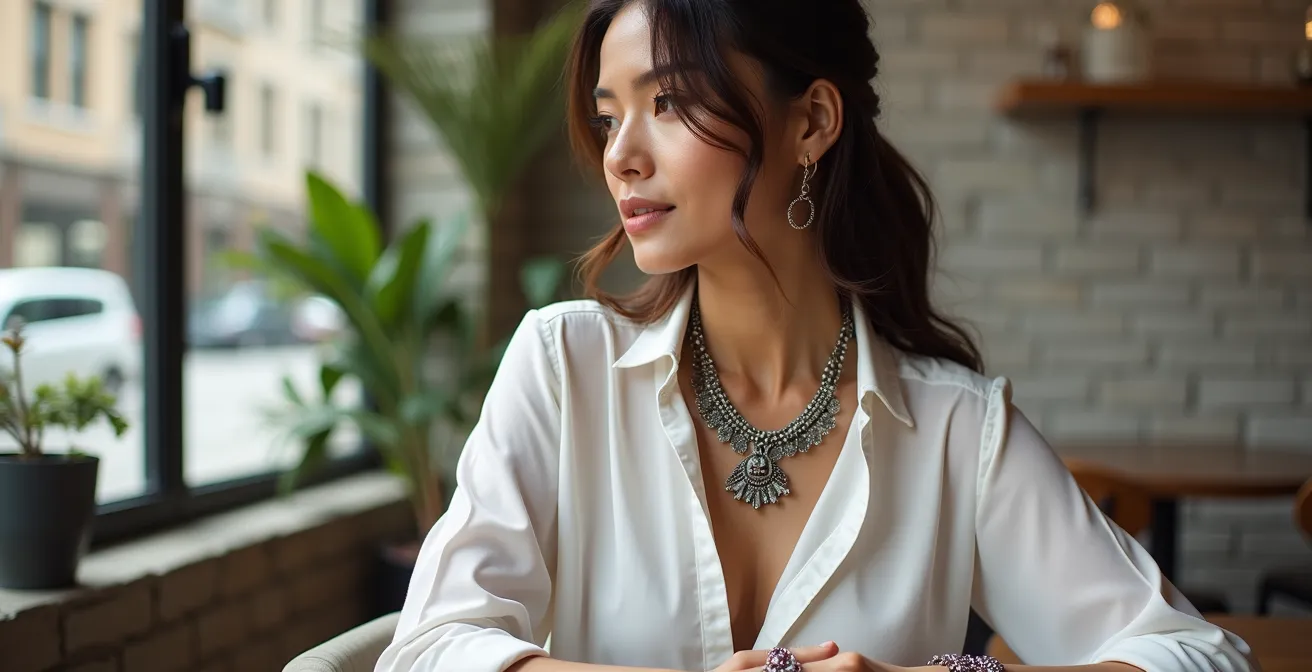 Uno de los mayores mitos del estilo boho es que «más es más». Esta idea, perfecta para un festival de música, es un completo desastre en un entorno urbano y profesional. La elegancia reside en el equilibrio y la contención. El objetivo no es parecer un árbol de Navidad bohemio, sino seleccionar un único punto focal que hable por sí solo. Cuando acumulas demasiados anillos, pulseras y collares, ninguna pieza destaca y el resultado es caótico y visualmente abrumador, restando sofisticación a tu conjunto.