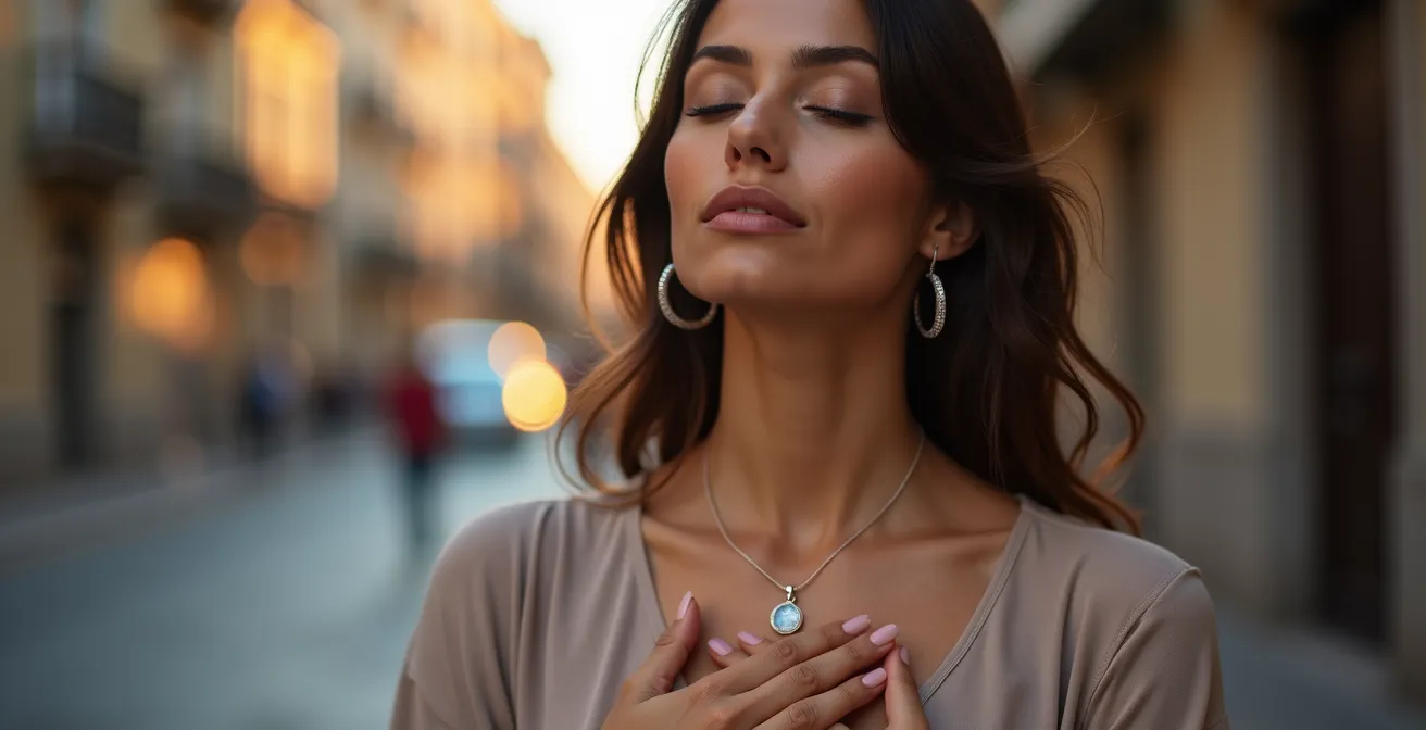 El acto de llevar la mano a tu cuello y sentir la textura y la temperatura de tu joya es un gesto discreto y accesible en cualquier situación: en medio de una reunión, en el coche antes de recoger a los niños o en la cola del supermercado. No requiere cerrar los ojos ni adoptar una postura específica. Es un micro-ritual privado que interrumpe el patrón de estrés de forma inmediata, devolviéndote al momento presente a través de una sensación física y familiar.